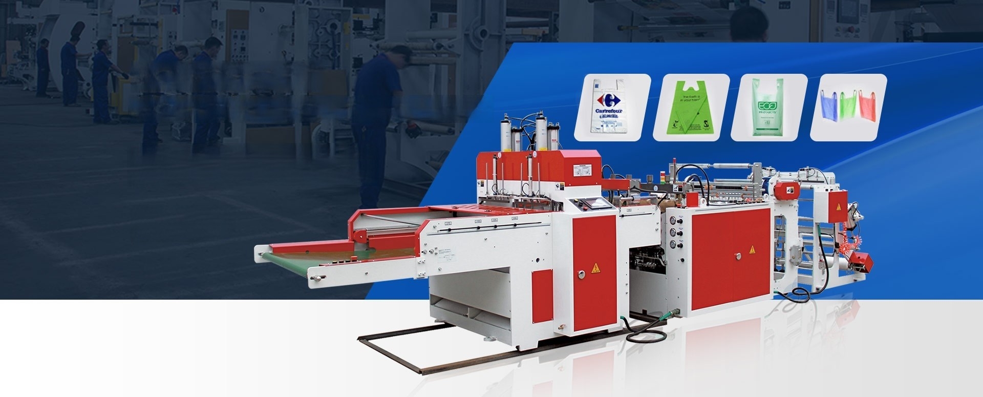 Plastic bag machine suit to produce plastic T-shirt bag, shopping bag, flat open bag, BOPP bag, mailing bag, stationery bag, vegetable bag, fruit bag, rice bag, trash bag.
